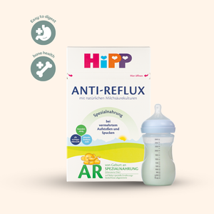 This all-stage Anti Reflux baby formula by HiPP helps to reduce spit-up and burping in babies from birth to 12 months. HiPP Anti Reflux formula can be used for the exclusive feeding of babies or as a supplement to breast milk and offers a complete source of nutrition for infants.