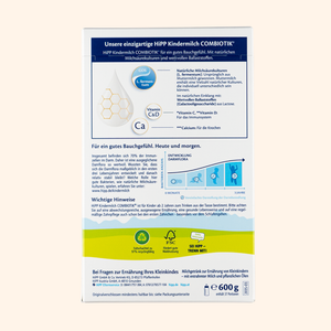 HiPP Kindermilch Combiotik 2+ is a growing up formula designed for children from the second year onwards, enriched with essential nutrients to support their active lifestyle. It complements a family diet, providing well-rounded nutrition.