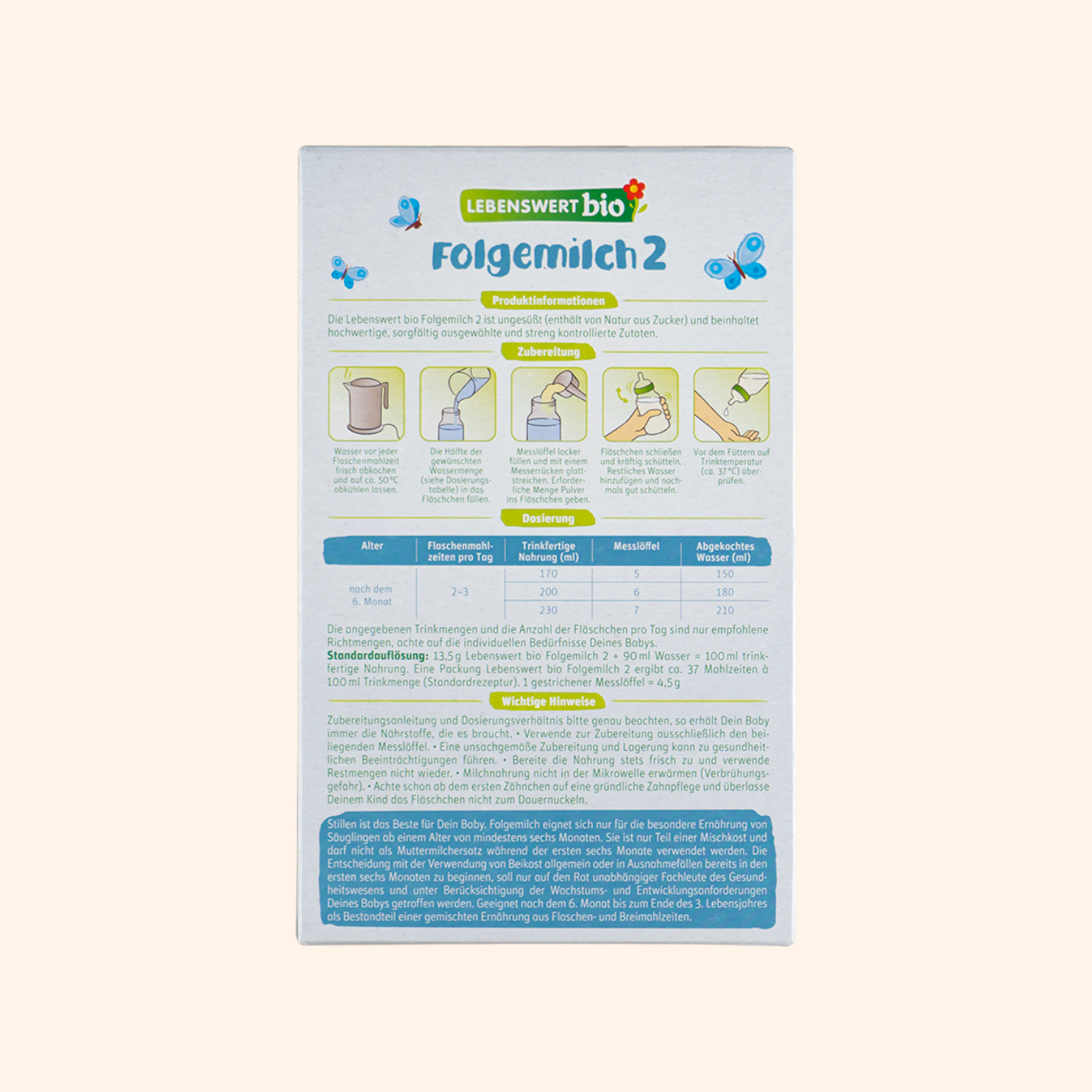 This stage is similar to Lebenswert Stage 1 but has a different protein ratio to accommodate the dietary needs of older babies. In other words, Lebenswert Stage 2 changes in the same way breast milk changes over the course of lactation.